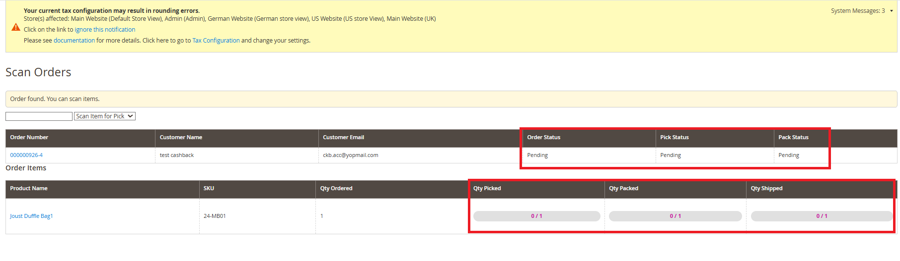 Go to Sales > Scan Orders, where you will see that the Order Status is Pending, the Pick Status is Pending, and the Pack Status is Pending. Please refer to the screengrab below.