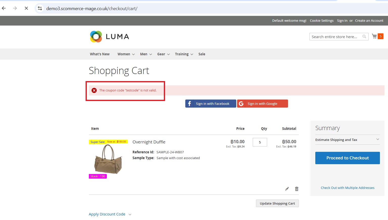 Login to the Admin Panel, navigate to Marketing > Cart Price Rules, and create a coupon code named “testcode”. When applied on the cart page, this coupon should not be valid for Sample products.products.