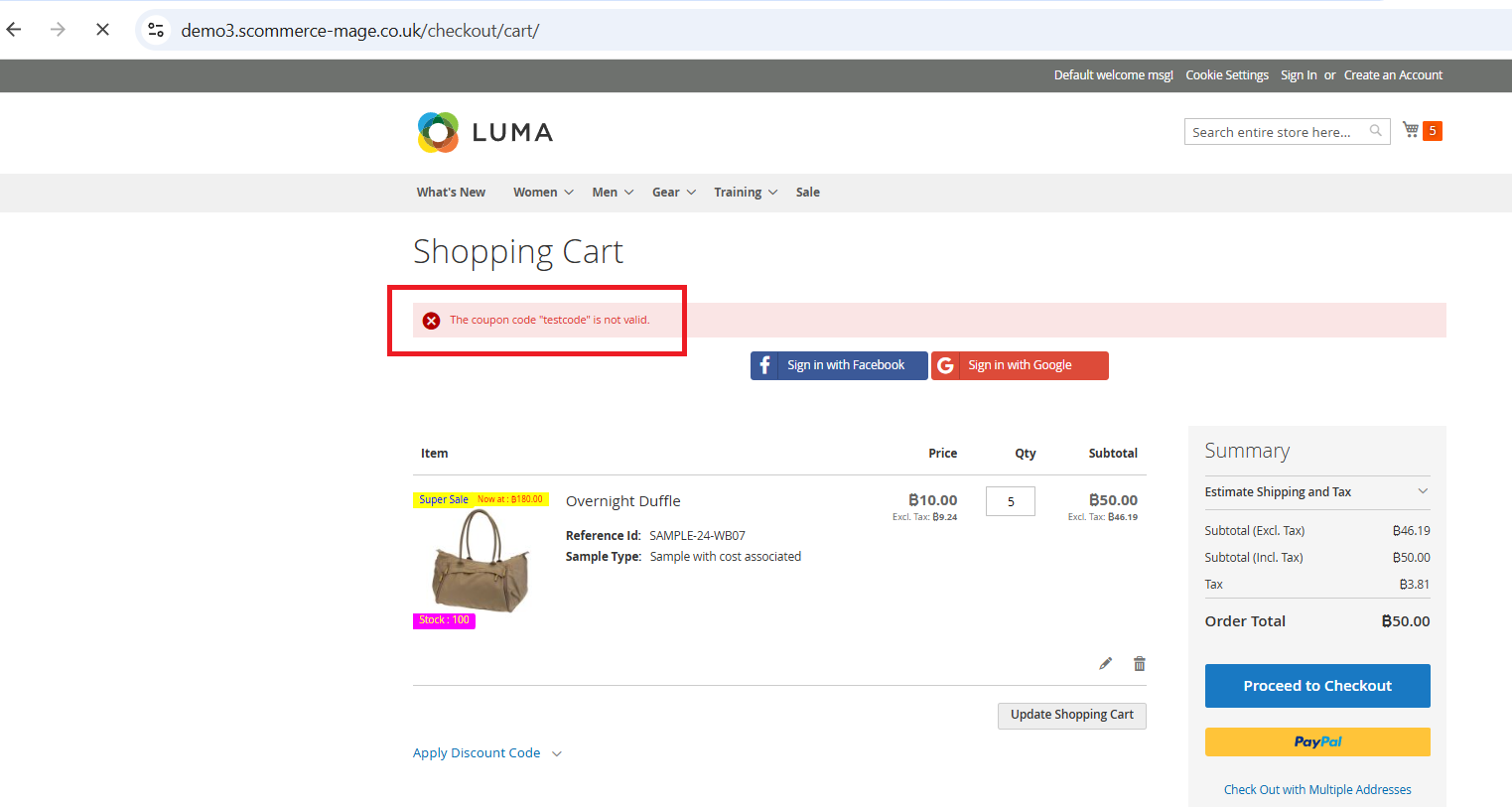 Login to the Admin Panel, navigate to Marketing > Cart Price Rules, and create a coupon code named “testcode”. When applied on the cart page, this coupon should not be valid for Sample products.
