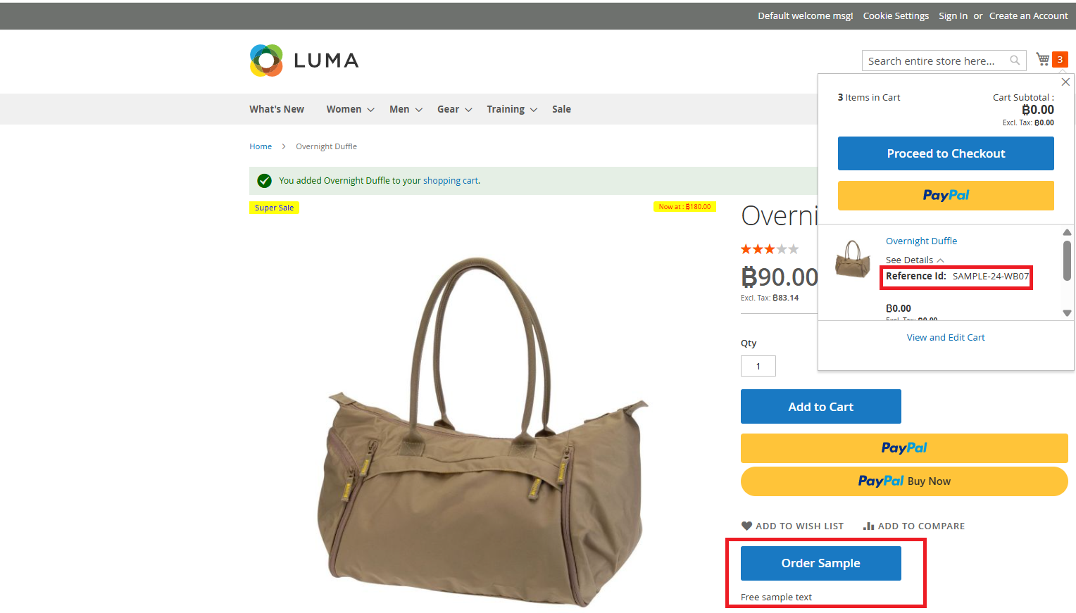 Login to the Admin Panel, navigate to Catalog > Products, and select the product you want to edit. Click Edit, then scroll down to the Sample Product section. From the Sample Type dropdown, choose Free Sample. On the frontend product page, the default quantity is set to 3, allowing the product to be added to the cart.