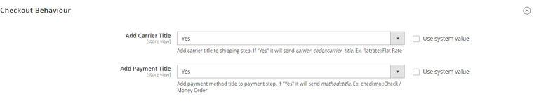 - Add Carrier Title:- Use this to add carrier title to the shipping step. Set "Yes" to send carrier_code::carrier_title. Ex. flatrate::Flat Rate
