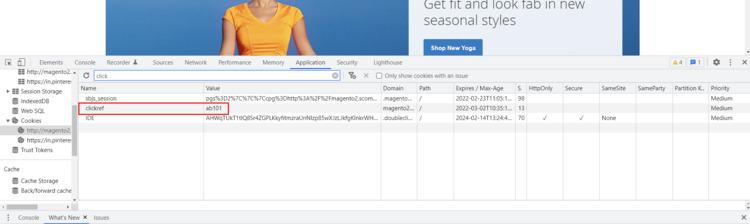 http://magento2.scommerce-mage.co.uk/?clickref=ab101 :- In this url we passed the cookie parameter "clickref" with the value "ab101". We can see this cookie being created in the below image:-