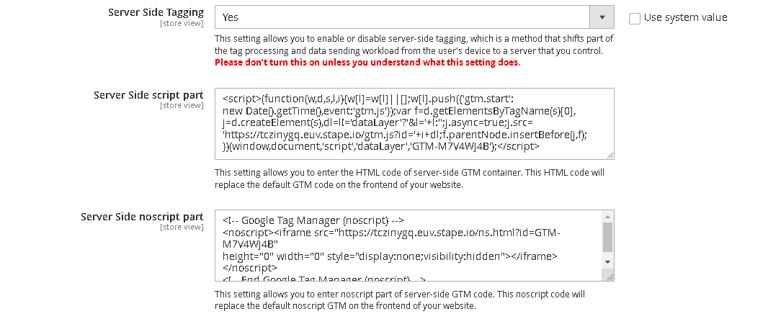 ServerServer Side noscript part - Enter the noscript part of server-side GTM code. It will also replace the default HTML code on the frontend.