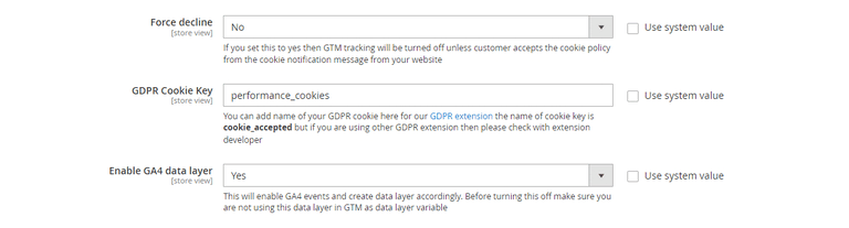 - Force decline – If you set this to yes then GTM tracking will be turned off unless customer accepts the cookie policy from the cookie notification message from your website