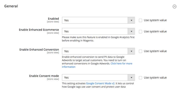 - Enable Enhanced Ecommerce – Select ‘Yes’ to enable this module. Please make sure this feature is enabled in Google Analytics first before enabling in Magento2.