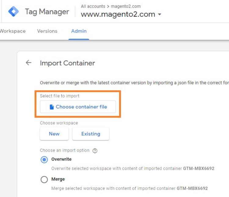 Step 3:- Click on Choose container file and choose the JSON file acquired in step 1 then select the workspace new/existing. Also select Merge>Rename conflicting tags, triggers, and variables so that no crucial setting is lost.