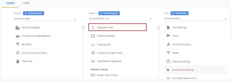 - Once you are in universal analytics panel go into admin settings. Here you will notice an UPGRADE TO GA4 button, click on it. You will be walked with creating a new property. Follow along, once you are finished you will see the new GA4 view on your screen.