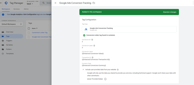 Once done import the JSON file named "GTM-google_ads_enh anced_conversion_tracking.json" if or import "GTM-google_ads_enhanced_conversion_tracking_using_datalayers.json" provided with the extension(data folder) in your GTM container . Change the 'conversion label' and 'conversion ID' in the "Google Ads Conversion Tracking" tag. Finally publish the changes to finish the setup.