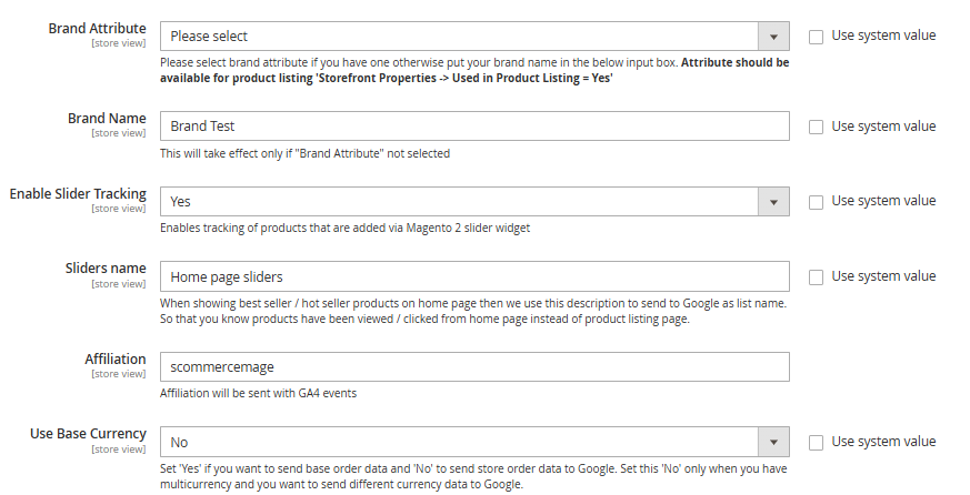 PrimaryBrandCategoryNameAttribute-–WhenPleaseaaddproductthe Brand Name. This will take effect only if the 'Brand Attribute' isinnotmore than one category then the primary category attribute will be sent to Google.selected.BrandEnableAttributeSlider–Tracking - SelectPlease'Yes' to enable tracking of products added via the Magento 2 slider widget- Sliders name- Enter the name for custom sliders that will be sent as list name with the data layer.