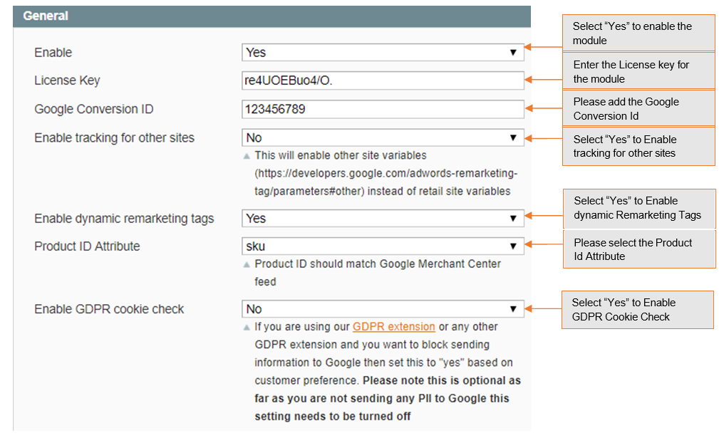 Enable GDPR cookie check – If you are using our GDPR extension or any other GDPR Extension and you want to block sending information to Google then set this to "yes" based on customer preference. Please note this is optional as far as you are not sending any PII to Google this setting needs to be turned off.