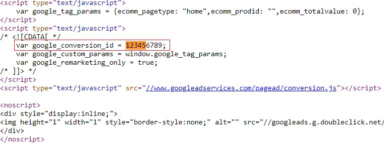 Dynamic Remarketing Tag/Code Snippets with Product Details – In the code snippet you can see the product details with Product ID and Google conversion id. You can select Product Id attribute from Admin > Stores > Configuration > Google Remarketing > Product Id attribute – Select "SKU".