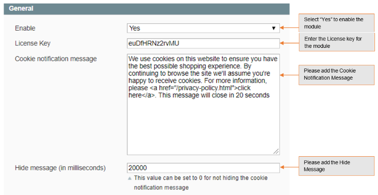- Cookie Notification Message – Please add the cookie notification message which will be displayed on the frontend.