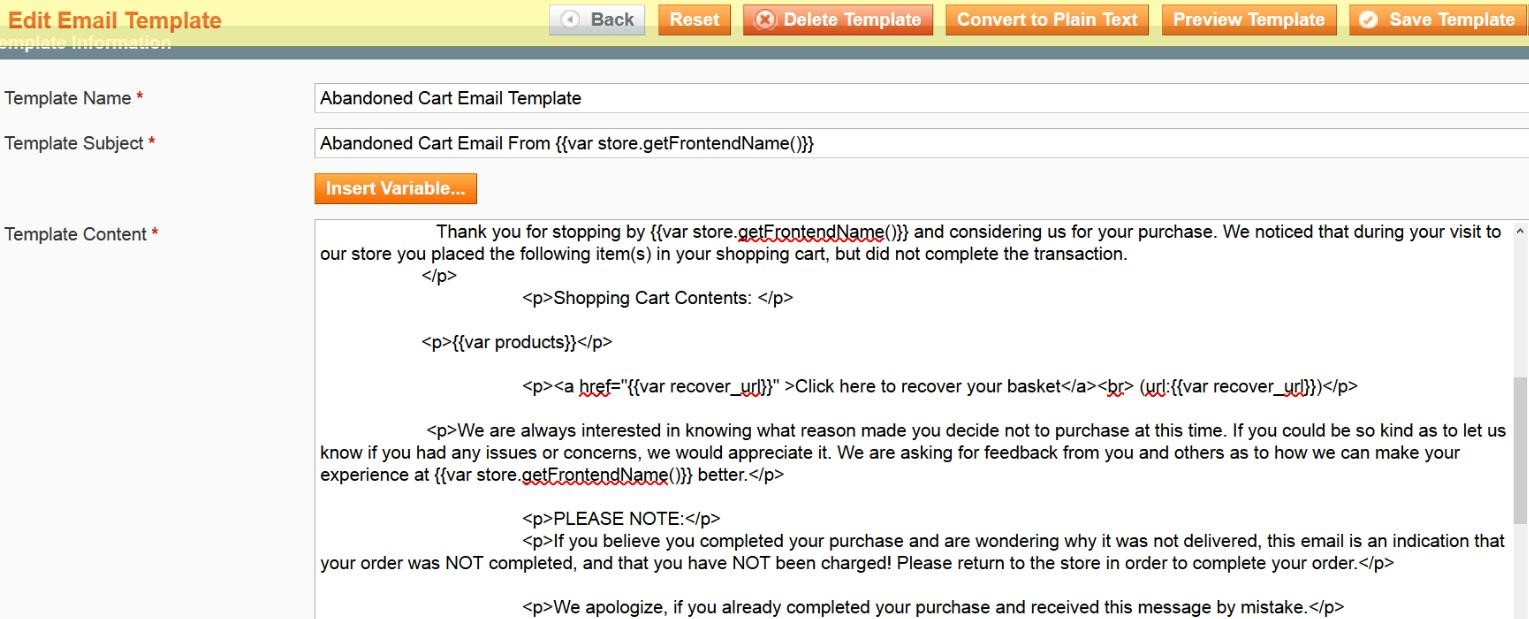 - Email Template – Select email template from drop-down if you have created your own version of Abandoned cart email template using system > transaction email section of admin. If not selected it will use default email template provided as part of the module.