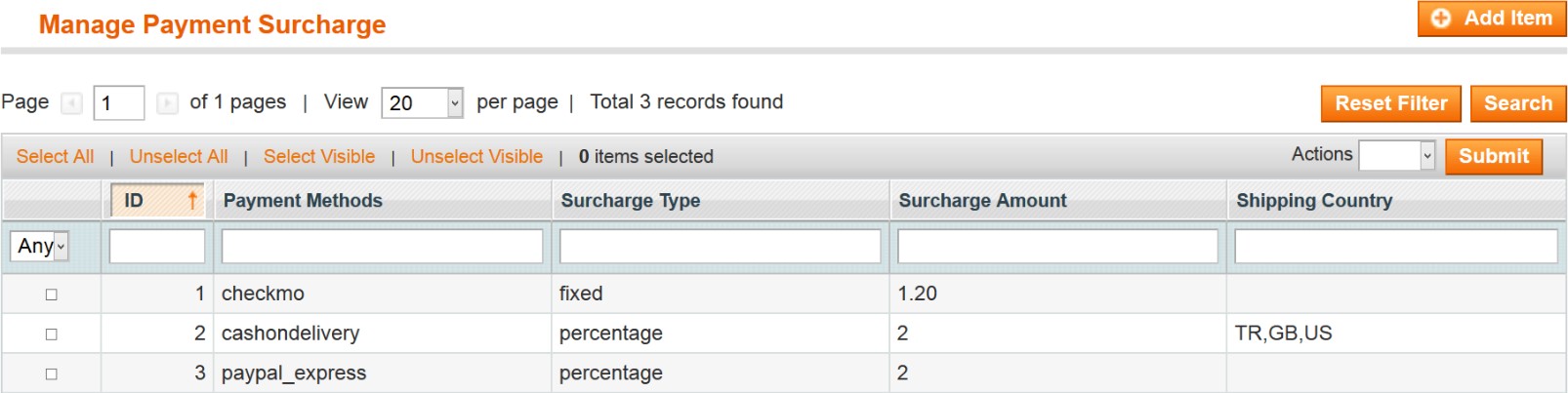 Manage Payment Surcharge - Here is the payment surcharge grid:-