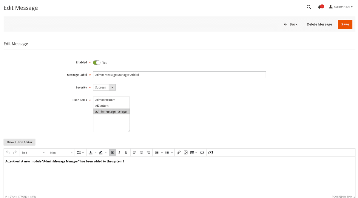 - Required fields: Enabled, Message Label, Severity, at least one User Role, Message Text.