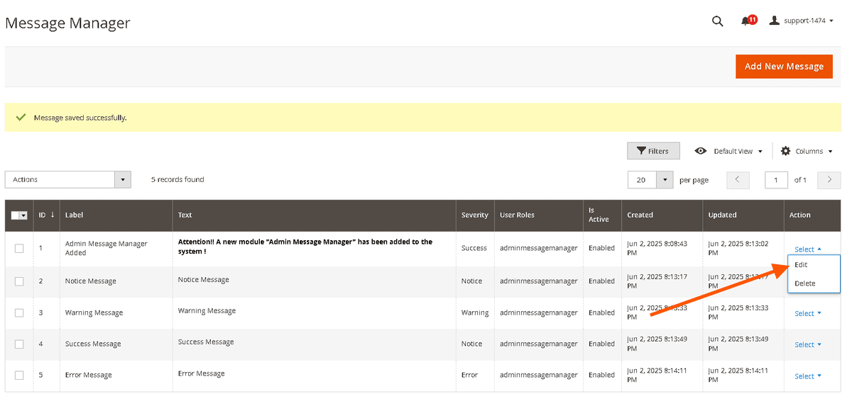 - In the grid, click "Edit" on the desired message.