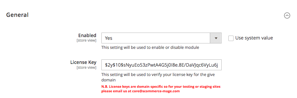- License Key – Please add the license for the extension which is provided in the order confirmation email. Please note license keys are site URL specific. If you require license keys for dev/staging sites then please email us at support@scommerce-mage.com.