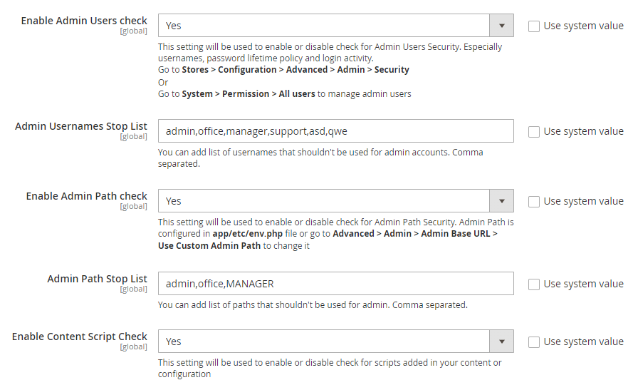 Enabled Admin Path Check:- This setting will be used to enable or disable check for Admin Path Security. Admin Path is configured in file or go to Advanced > Admin > Admin Base URL > Use Custom Admin Path to change it