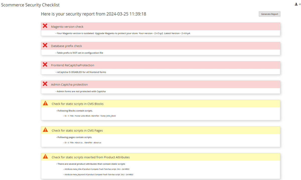 - Check for static scripts inserted from Product Attributes: - For Static scripts inserted by any product attributes the user will see a warning with the name of the attribute otherwise, success.
