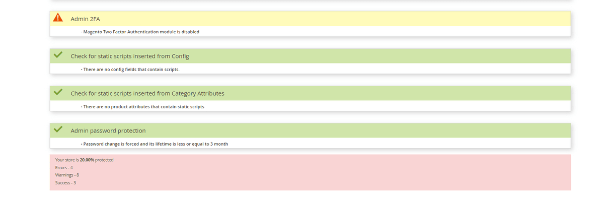 - Admin path protection: - For Admin path protection, if the user's admin path doesn't contain words from the stop list, doesn't contain numbers or capital letters, and is at least 15 characters long, the user will see a success. If any of the criteria mentioned are not fulfilled, the user will see a warning.