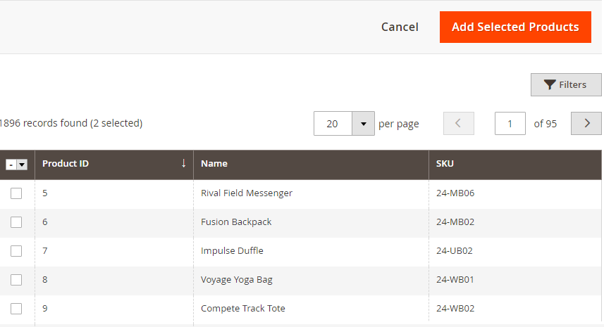• Product Grid at Product Level – You can add products from Admin > Catalog> Products > Select Product > Product Association > Click "Add Product" > Product Grid > Select Products > Click "Add Selected Products".