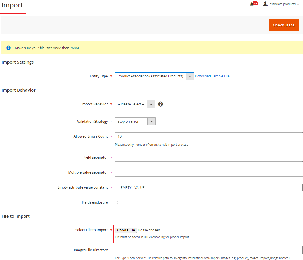 To import associated products go system > Data transfer > Import. Then select product association from the drop down list. You will see the importing menu opening on your screen as shown in the image below. Select the import file and add import behavior settings as per your preferences. Lastly click on check data button on the right corner of your screen.