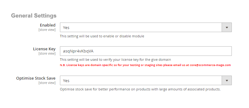 • License Key - Please add the license for the extension which is provided in the order confirmation email. Please note license keys are site URL specific. If you require license keys for dev/staging sites then please email us at support@scommerce-mage.com.