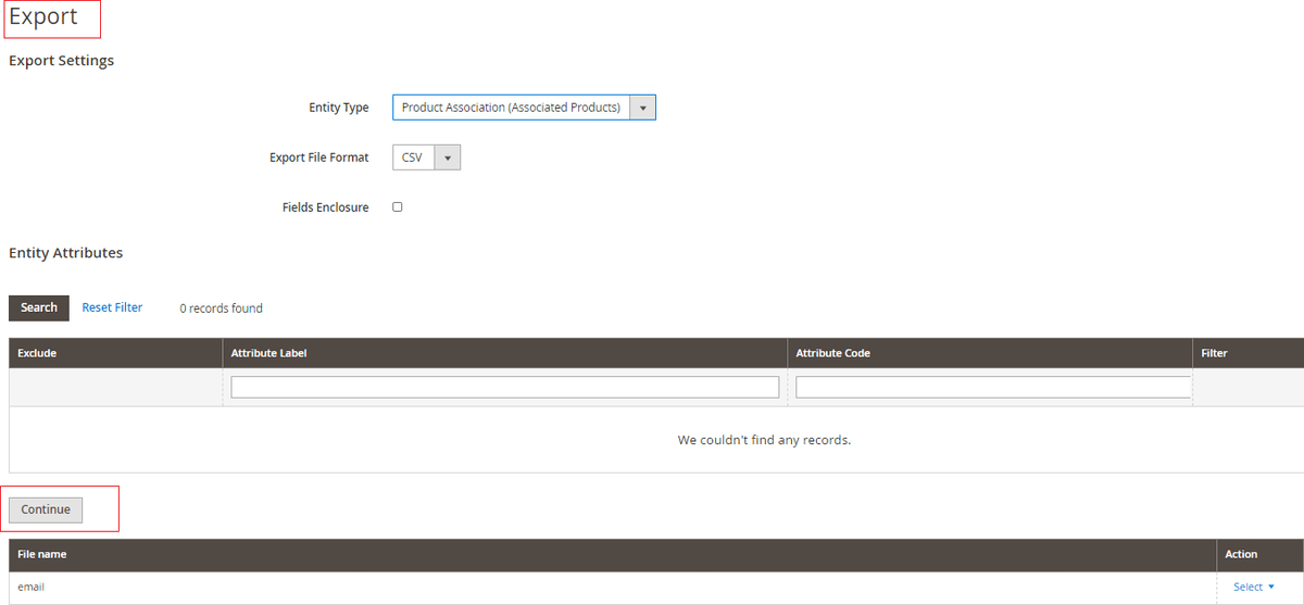 • Export – Go to System > Data Transfer > Export. Select product associated in the entity type dropdown list. You should see the export menu popup on your screen as shown in the image below: -