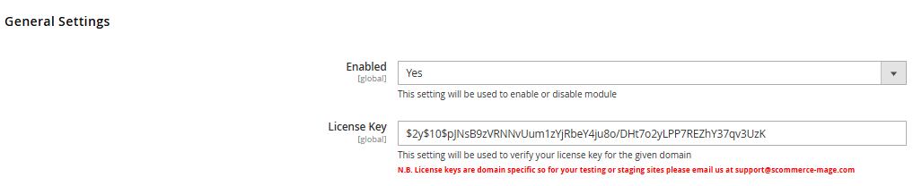 - License Key – Please add the license for the extension which is provided in the order confirmation email. Please note license keys are site URL specific. If you require license keys for dev/staging sites then please email us at support@scommerce-mage.com.