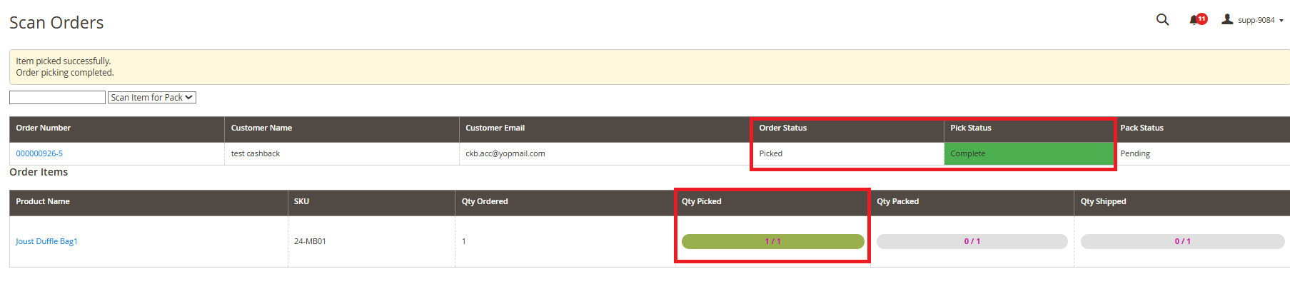 Next, enter the Barcode value 12345678 in the Scan Items field for Pick and again in the Scan Items field for Pack. Once completed, the status will update to Complete