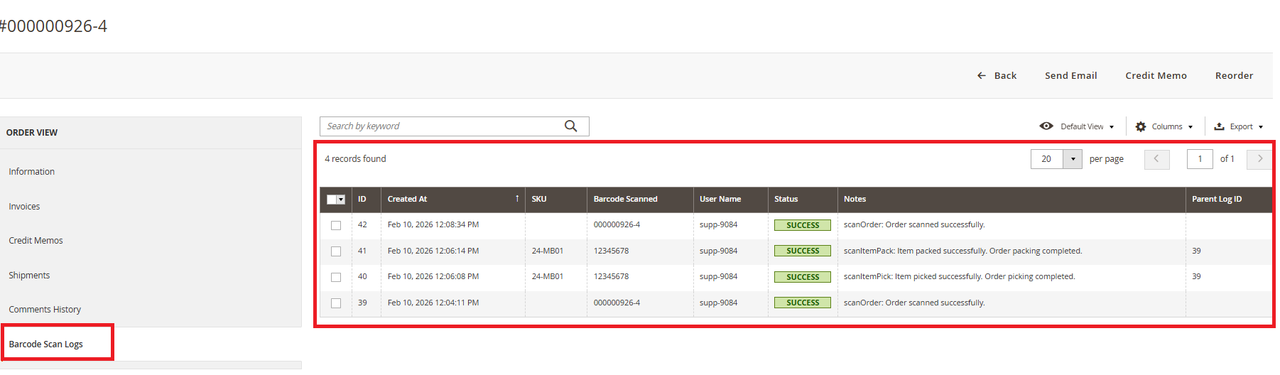 You can check the Barcode Scan Logs by navigating to Admin > Sales > Orders > Edit > Barcode Scan Logs. All order statuses will be shown as Success.