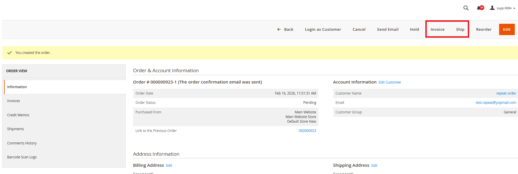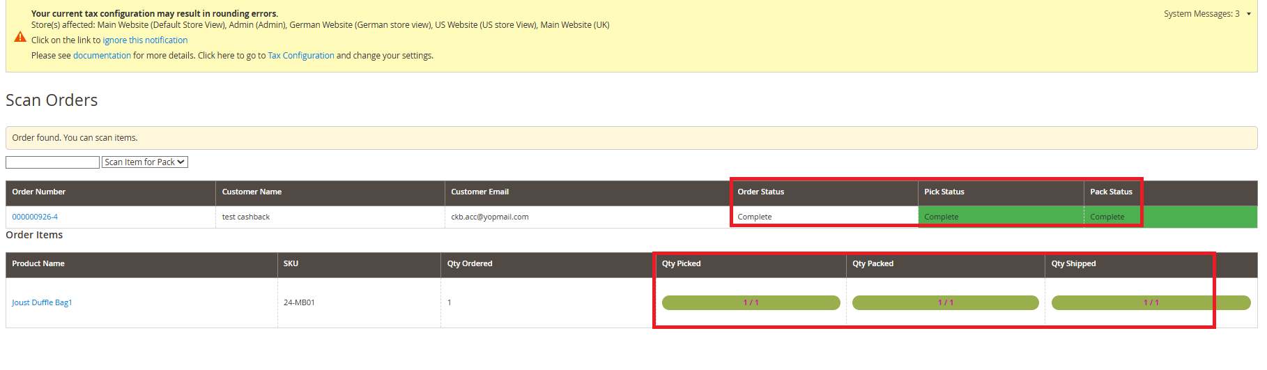 Then go to Admin > Sales > Orders. Create the invoice and ship the order. Once completed, the order status will display as Complete in Scan Orders.
