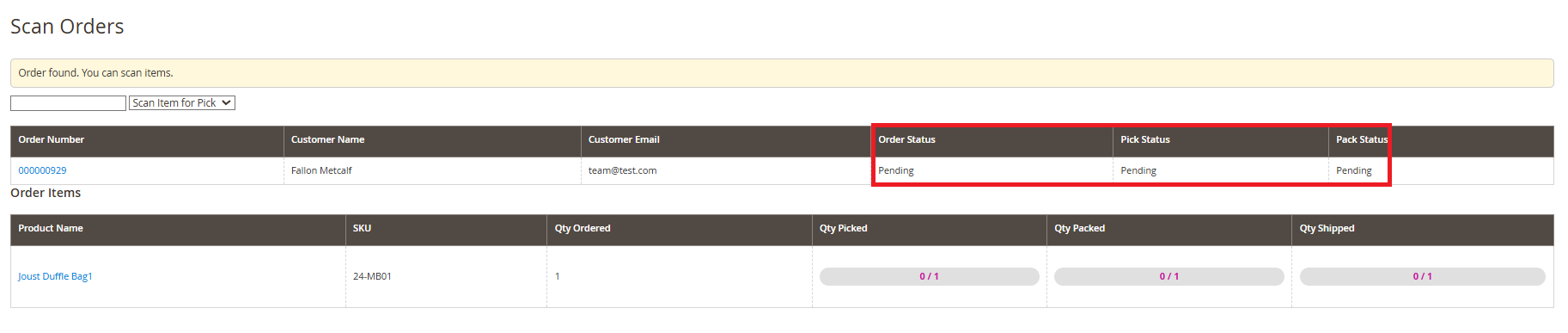 Go to Admin > Sales > Scan Orders. Enter the order number in the Scan Order field. The system will then display the status as Pending under Order Status, Pick Status, and Pack Status.