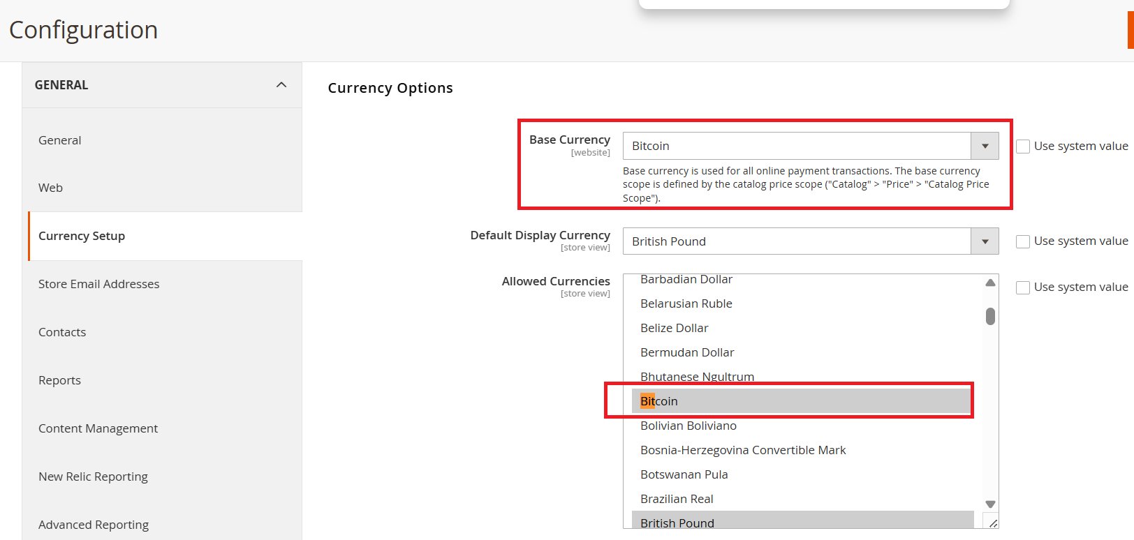 To configure your store’s currency settings, go to Admin Panel > Stores > Configuration > General > Currency Setup, where you can choose the base currency, default display currency, and allowed currencies. Please refer to the screenshots below for visual guidance on setting up custom currencies.
