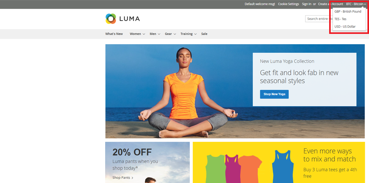 Currency Options available on the frontend - Default store view.
