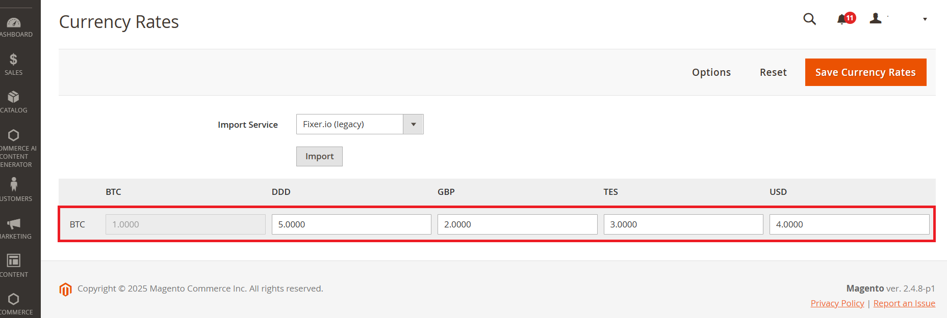 - Go to Admin Panel > Stores > Configuration > Currency Rates.