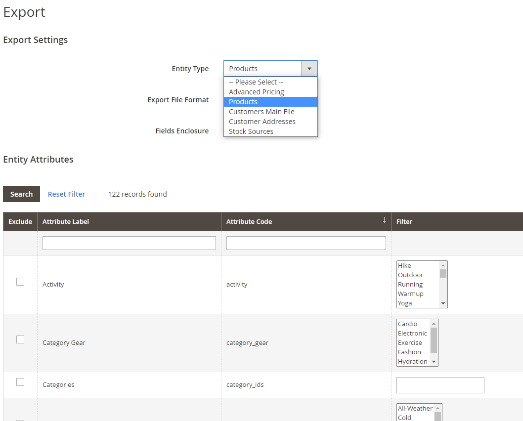 Step 2:- Select product from the 'Entity Type' dropdown list and select the attributes that you want to exclude from the export.