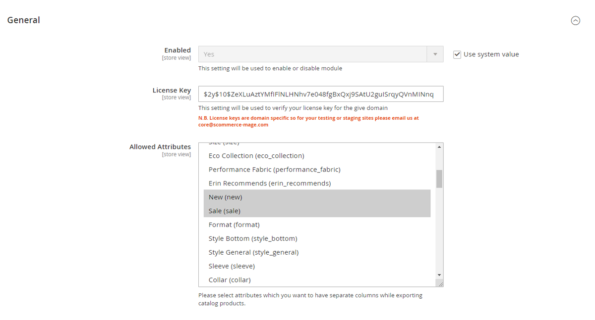 • License Key – Please add the license for the extension which is provided in the order confirmation email. Please note license keys are site URL specific. If you require license keys for dev/staging sites then please email us at support@scommerce-mage.com.
