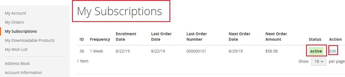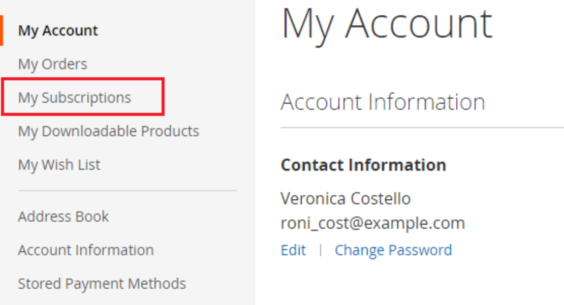 View / Edit Subscription Information from the Front-end/ My Account - On the front-end you can view and edit the subscriptions from My Account > My Subscriptions > Select Order > Edit.
