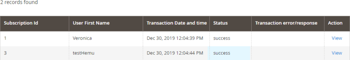 To see subscriptions payment details go to Admin> Scommerce Mage > Repeat Order > Subscription Payments. This grid will provide a view of payment status for the Payment transactions processed for automated subscription order. This will mainly have Subscription Id, First name, Transactions date and time, Transaction error/response.