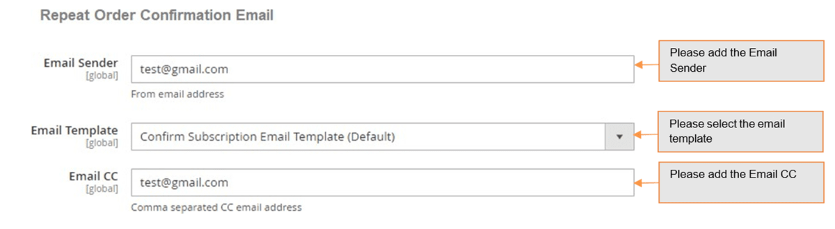 - Email Sender – Please enter sender/from email address for Repeat Order Confirmation Email.