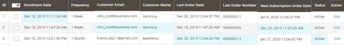 You can manage subscriptions from, Admin > Scommerce Mage > Repeat Order > Manage Subscriptions. This grid will have all the details about the subscriptions like Subscription ID, Frequency, Customer Email, Last Order date, Status, Action (Edit). With the action 'Edit' you can easily update subscription details and can also perform Cancel/Pause/Re-start actions.