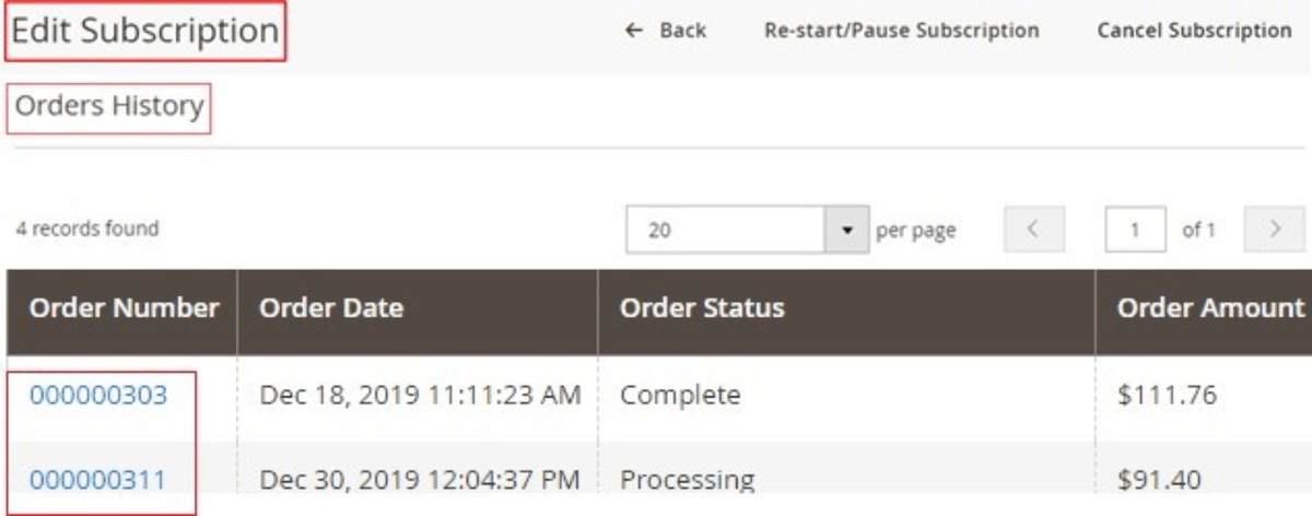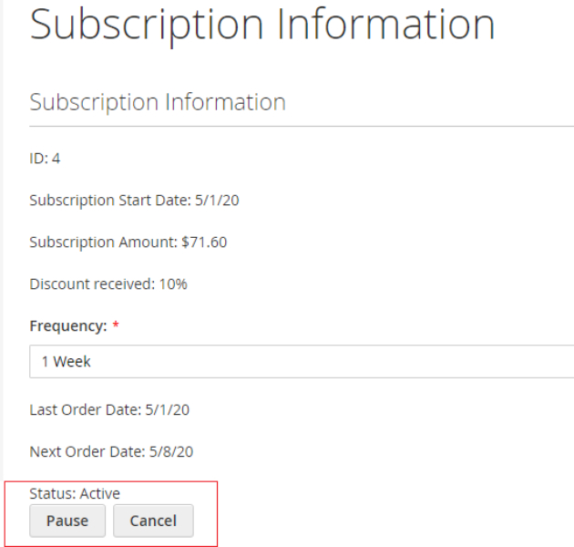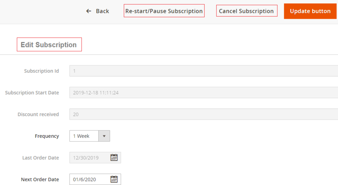 Re-start/Pause, Cancel Subscriptions - You can re-start, pause and cancel subscriptions from Admin > Scommerce Mage > Repeat Order > Manage Subscriptions > Select Subscription > Edit.