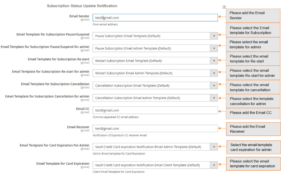 - Email Sender – Please enter sender/from email addresses for Subscription status update email.