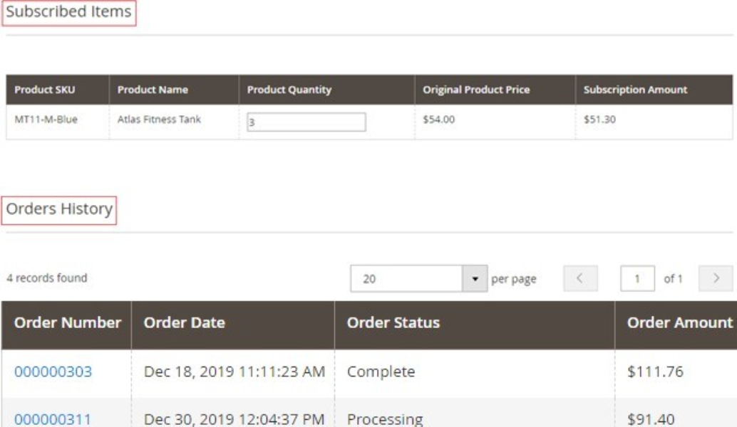 Subscribed Items and Order History on the Edit Subscription Page -** You** can see the subscribed items and order history from Admin > Scommerce Mage > Repeat Order > Manage Subscriptions > Select Subscription > Edit.