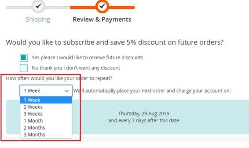 Frequency Selection Drop-down - On the checkout page when you check the subscription option then it shows frequency drop down, from where you can select the repeat order frequency.