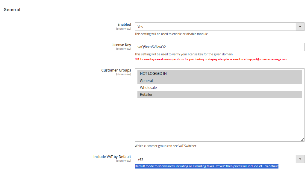 - License Key – Please add the license for the extension which is provided in the order confirmation email. Please note license keys are site URL specific. If you require license keys for dev/staging sites then please email us at support@scommerce-mage.com.