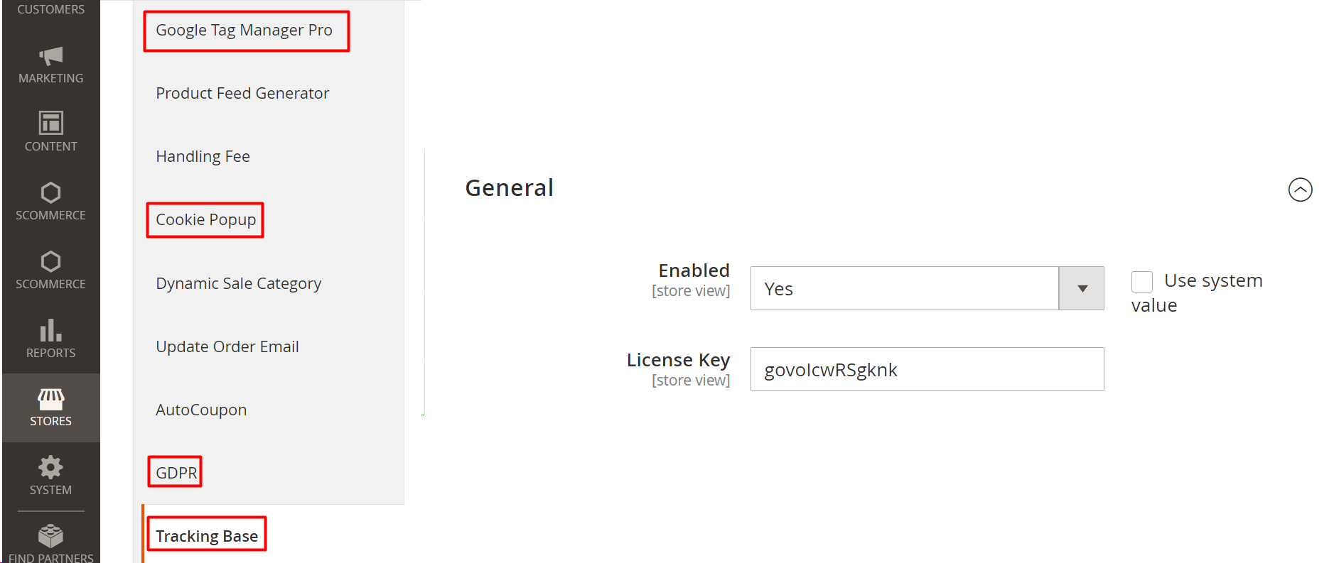 - Once you have installed the modules “Google Tag Manager Pro Tracking”, “Tracking Base”, ”Cookie Popup” and “GDPR”, enable them and enter the correct license key.