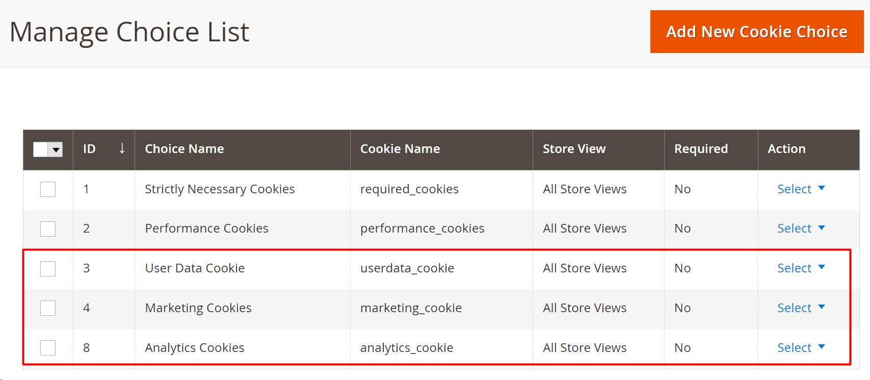 - After that, go to “Customers” -> “Manage Cookie Choices” and click on “Add new Cookie Choice” to set up cookie choices in the Cookie Popup extension.