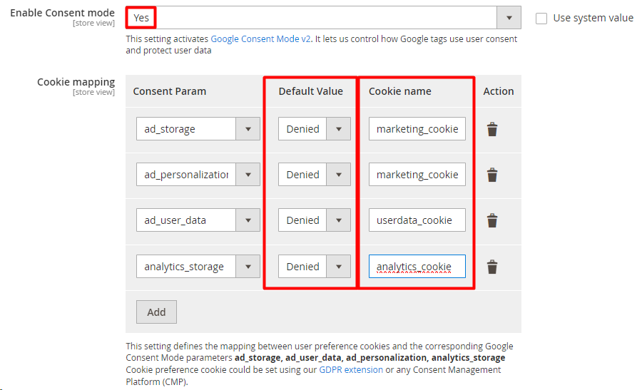 - Now, go to “System”->”Configuration”->“Tracking Base”. Scroll down and you would see the field “Enable Consent Mode”, enable it in order to enable the consent mode. Then, go to “Cookie mapping”, add the “Consent Param” that are given in the description”(personalization_storage, functionality_storage, security_storage are not mandatory for correct consent setup), set the “Default value” of the consent parameter as “granted” or “denied” based on the “Set by default” (step 2a) value of the cookie. Use the “Cookie Name” that you used while creating the cookies. For example- analytics_storage, if you want to do mapping of this consent param with Analytics cookie then in the field “Cookie name” add “analytics_cookie” because this cookie name was used when you were creating cookies (step 2a). While creating the cookie (in this case Analytics cookie), if the value of “Set by default” is set to “No” then while doing the mapping the “Default value” of the consent param (in this case analytics_storage) that is associated with that cookie should be set to “denied” or vice versa.
